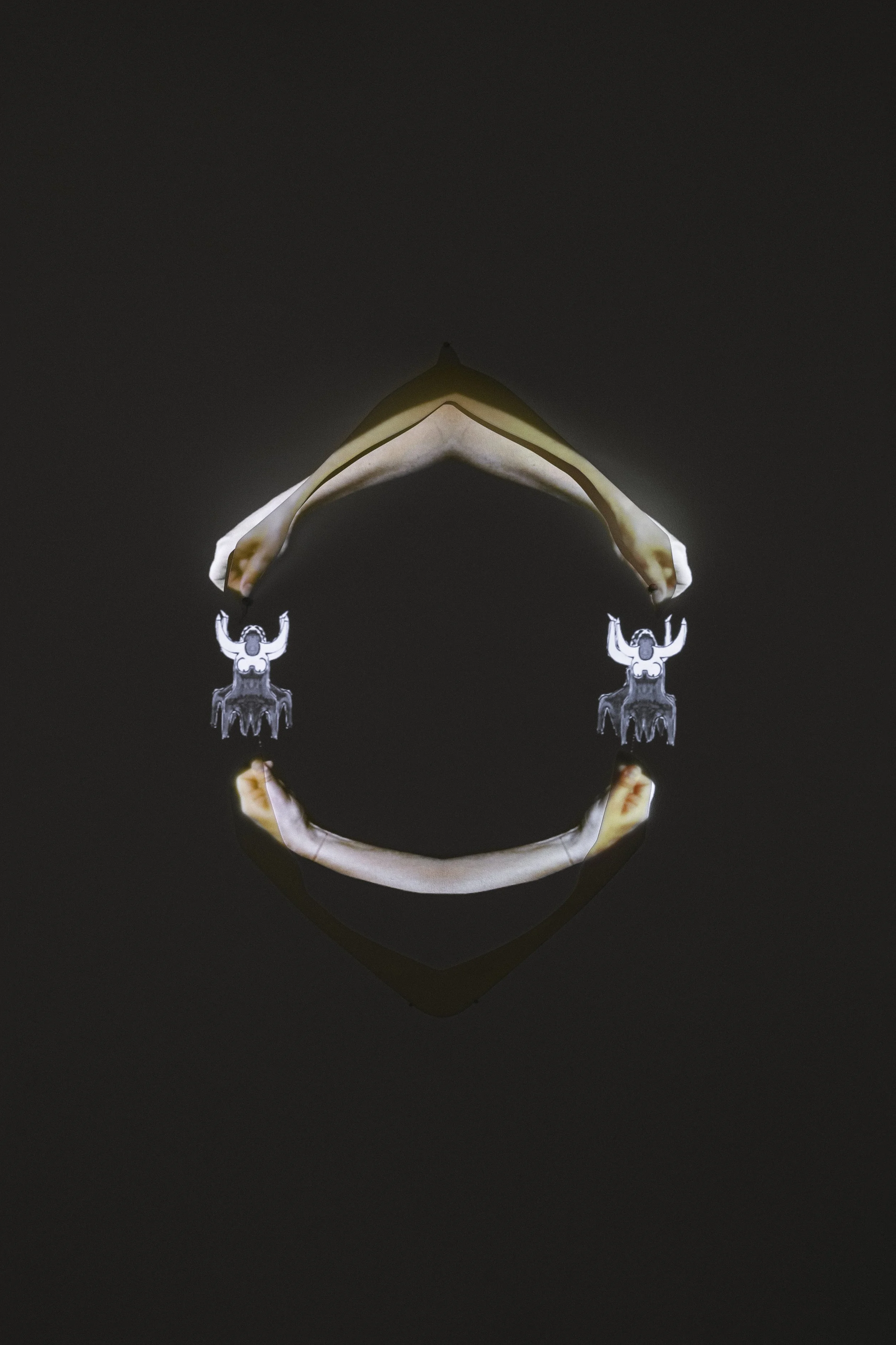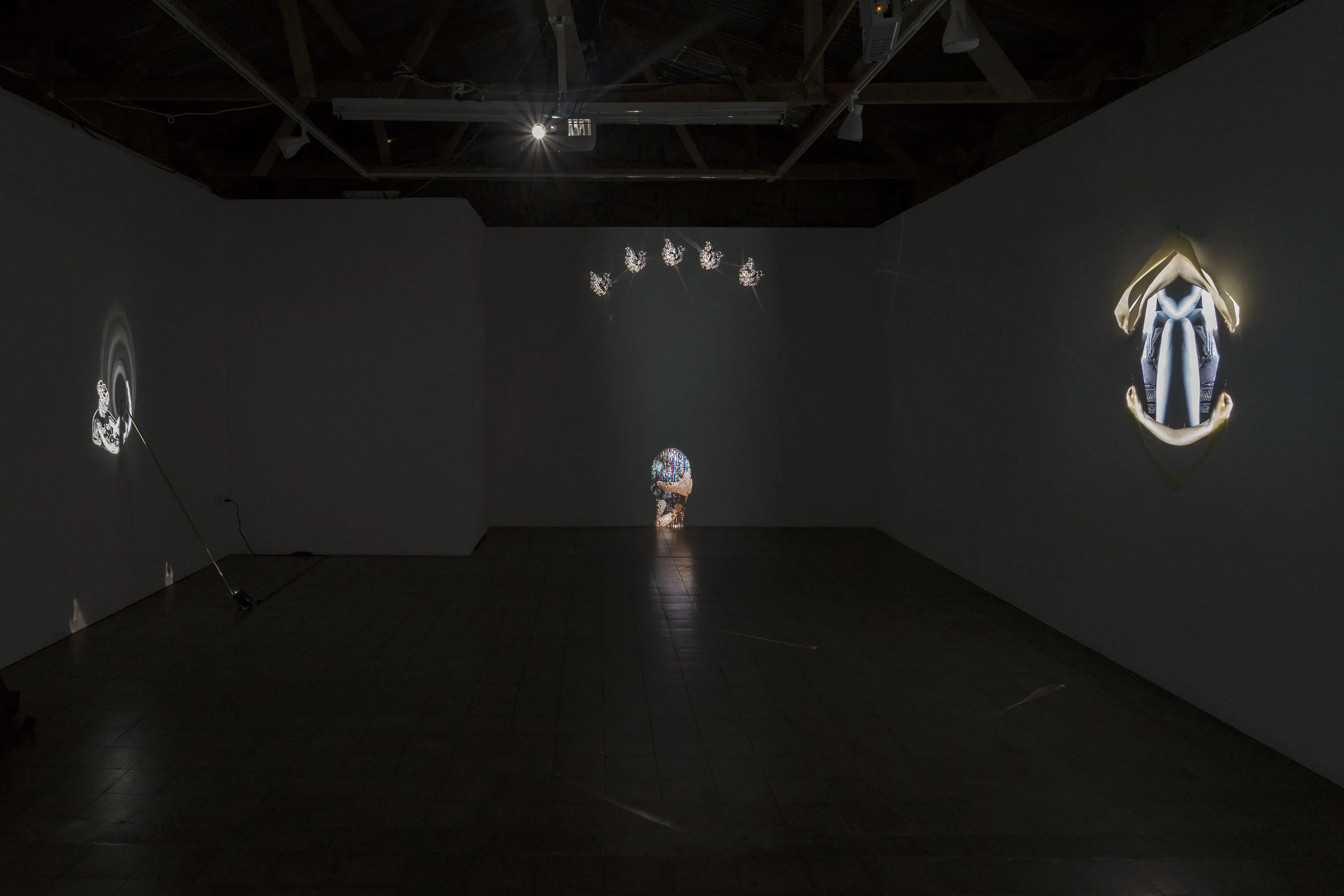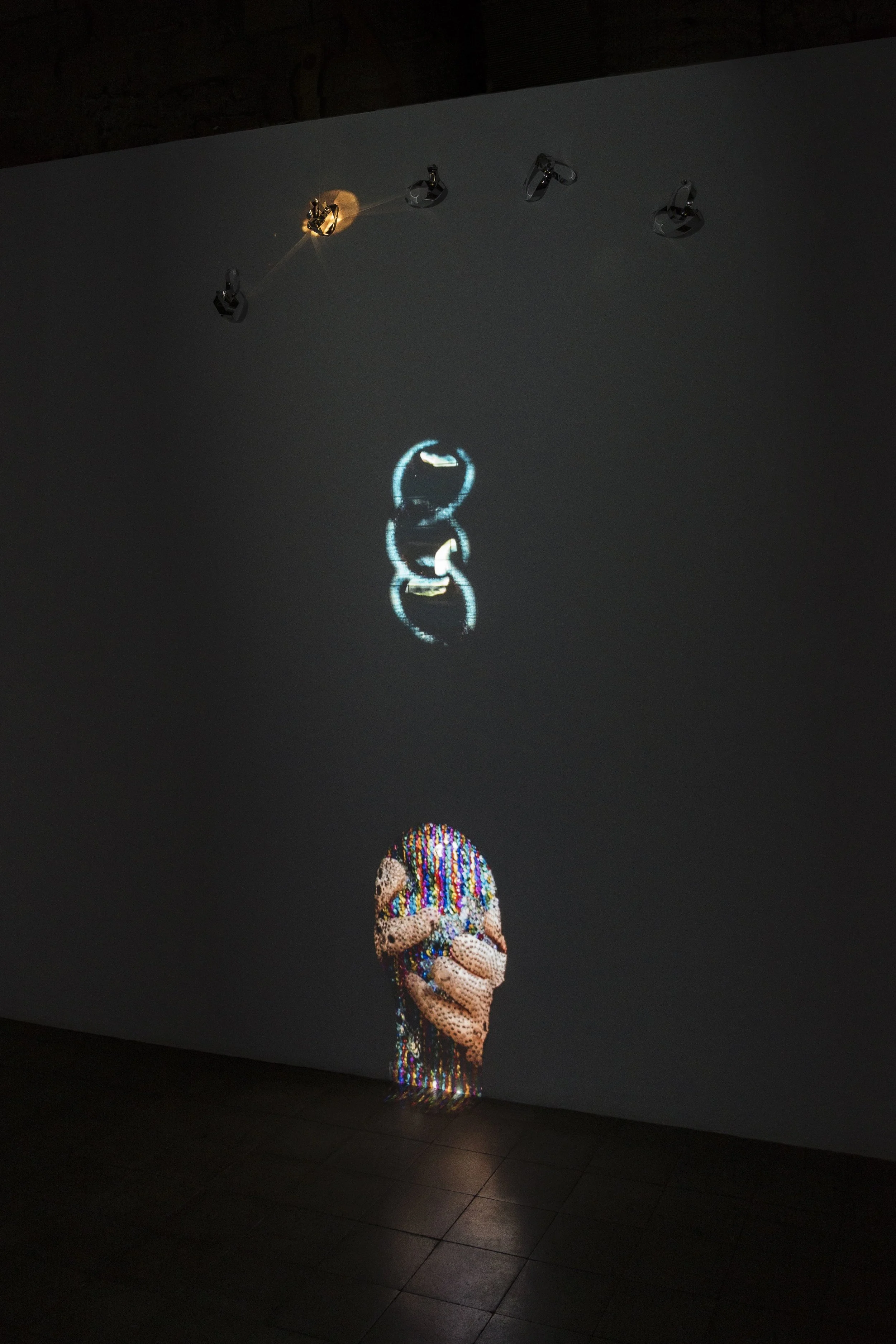 Body Assemblage presents five video-sculptures that collage female body-parts: hands, face, thighs, waist. The hands multiply in a kaleidoscopic fashion and orchestrate wondrous, mechanical twirls. They caress and transform a sequined head in one work, and in another they trace the contour of a floating female figure. The multiplied and manipulated videos form a body of sorts, an organic-artificial composition, that confuses the living with the inanimate. As the act of projection on objects unfolds the gap between the pixel and the material, the video-sculptures articulate the desire to touch the piece of art, to feel the video as an object and as matter. When immersed in the room with the video-creatures, breathing yet standing still, the viewer is presented with a new feminist potential of being.