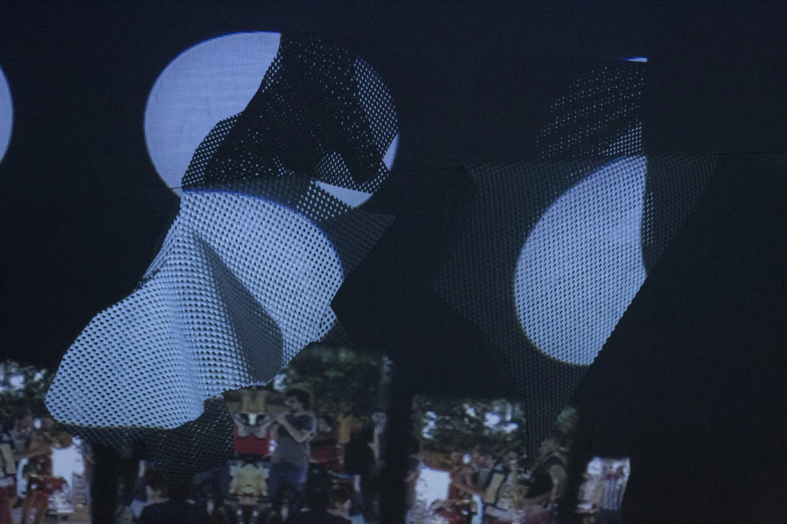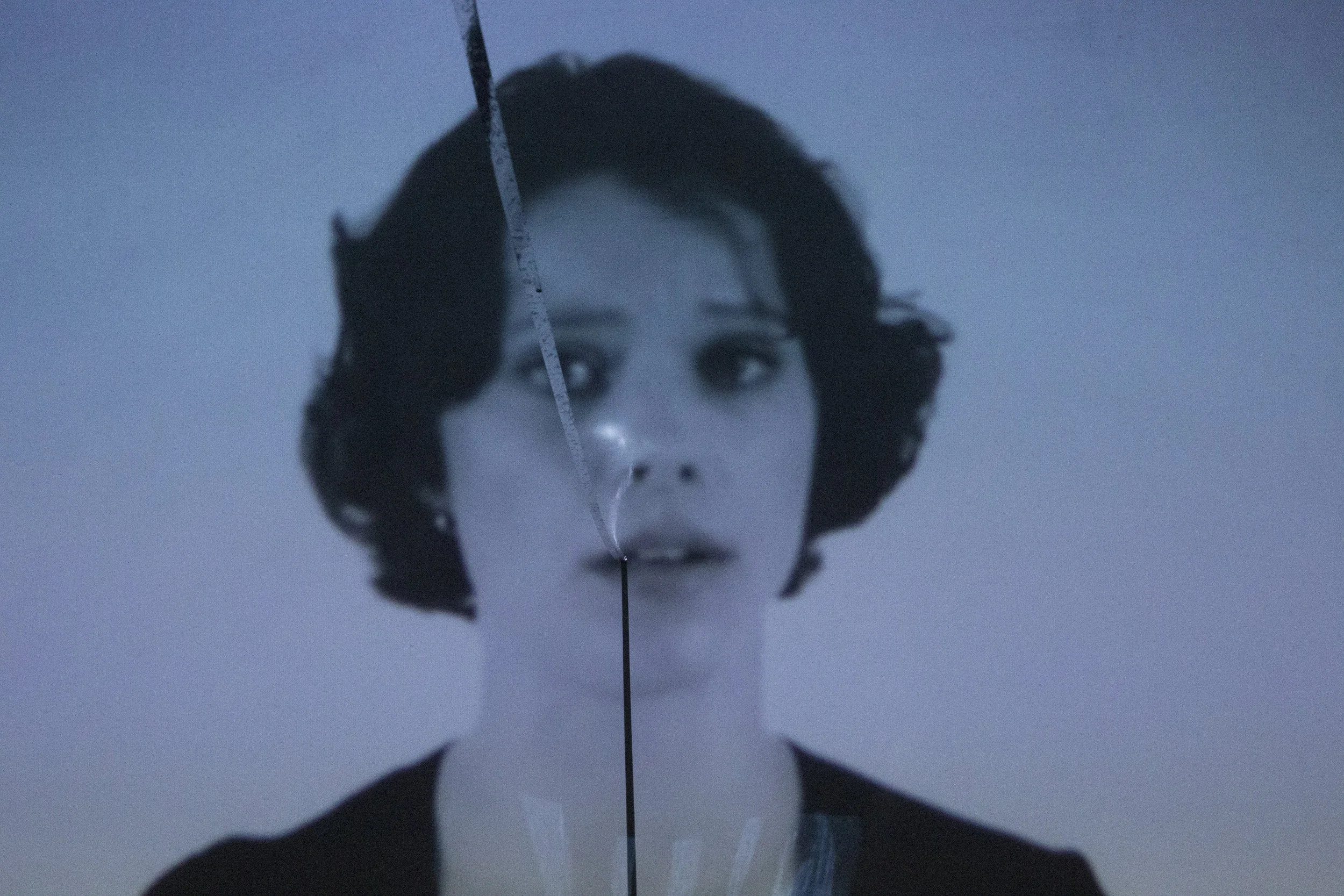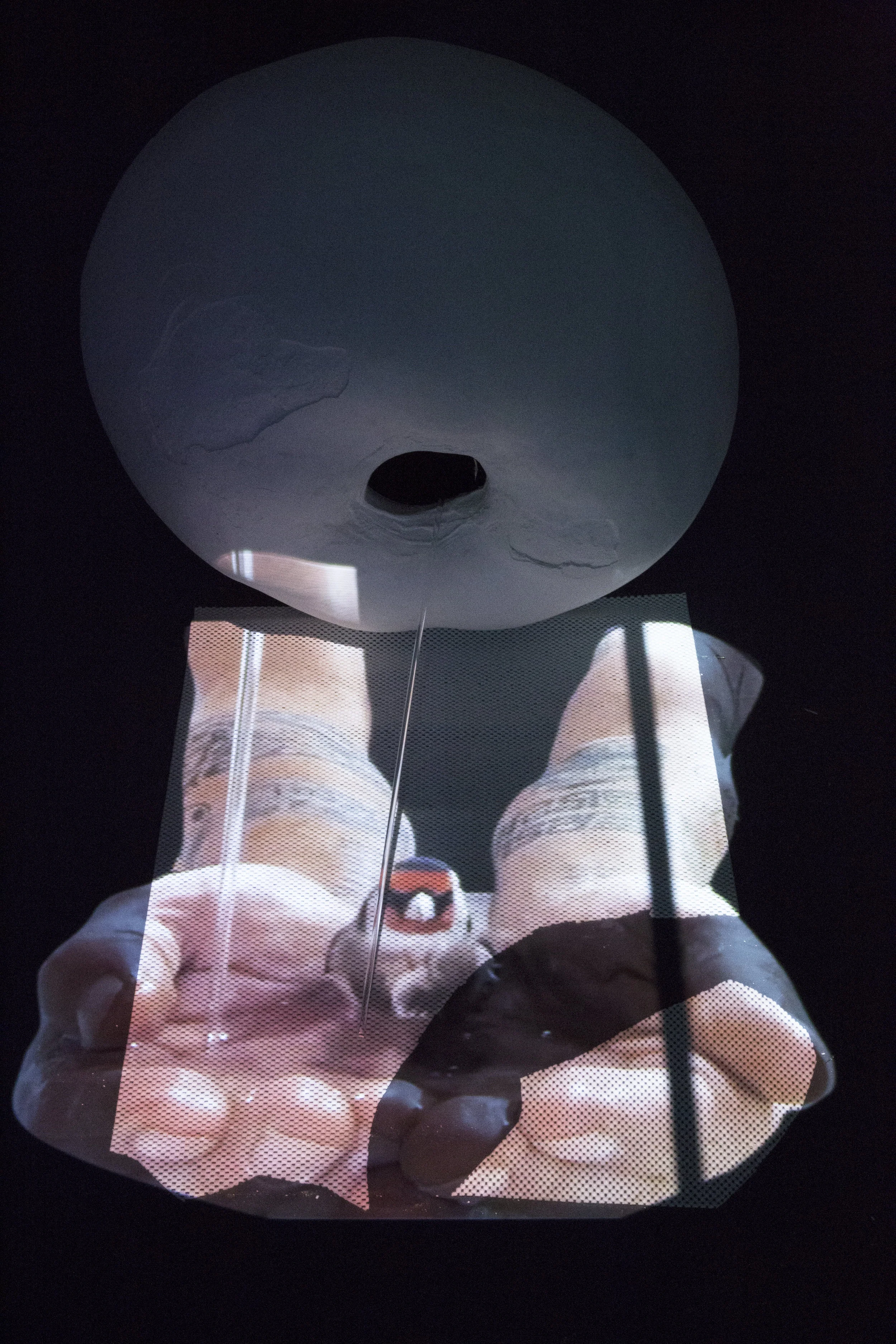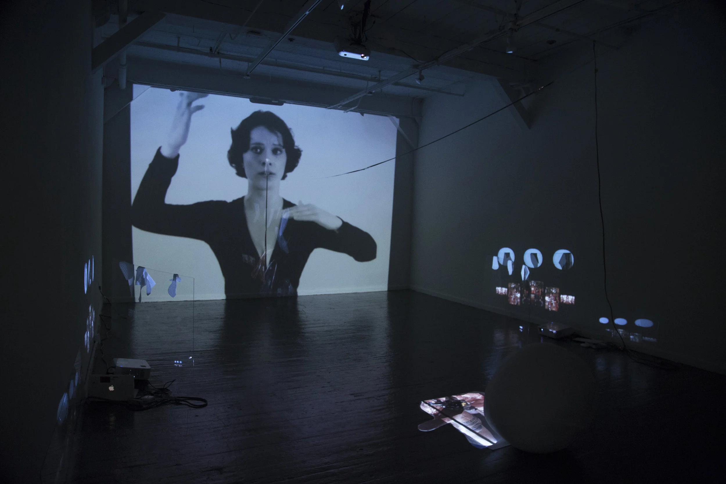 This installation includes four video projections and material interventions, combined with two sound pieces that were choreographed in a large space. The main large projection is a demonstrational video of a polyphonic singer, manipulated to seemingly “orchestrate” the other projection and sound elements in the space.